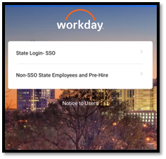 State employees who do not have SSO accounts with a state email address should have received temporary Workday credentials from their manager. Please use those credentials while following along. This access is referred to as Workday Native Access.